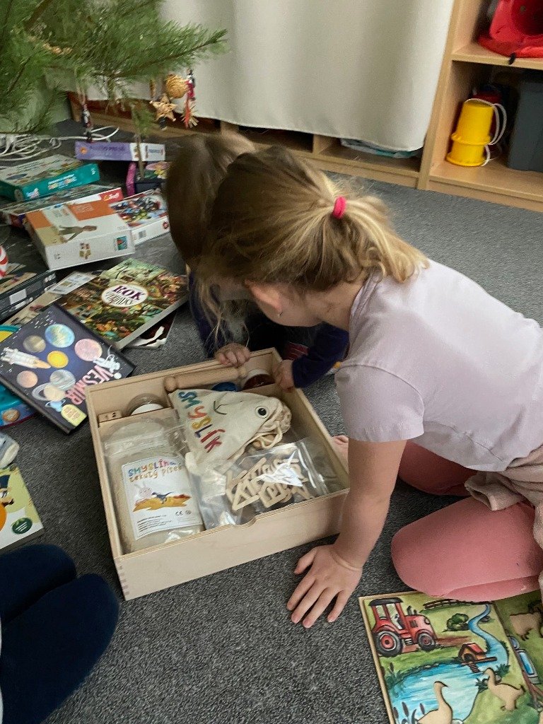 První ledový týden ve školce se nesl ve znamení oslav vánočních svátků - vzhledem k nízkému počtu dětí před Vánoci jsme se domluvili s Ježíškem a ten k nám přiletěl hned v pondělí 5.1.2025. Děti se vrátili z vycházky a Ježíšek jim zanechal vzkaz, proč přiletěl později a také spoustu krásných dárků. Velikou radost udělaly dětem papírové cihly ze kterých se rázem stal největší hit. Také přinesl krásné knihy, zajímavé didaktické pomůcky, kinetické písky, Smyslohraní a spoustu výtvarných potřeb, které hned využijeme.