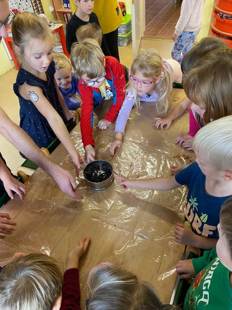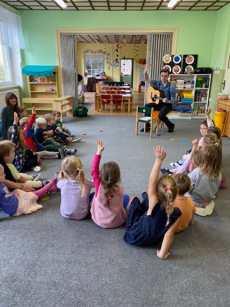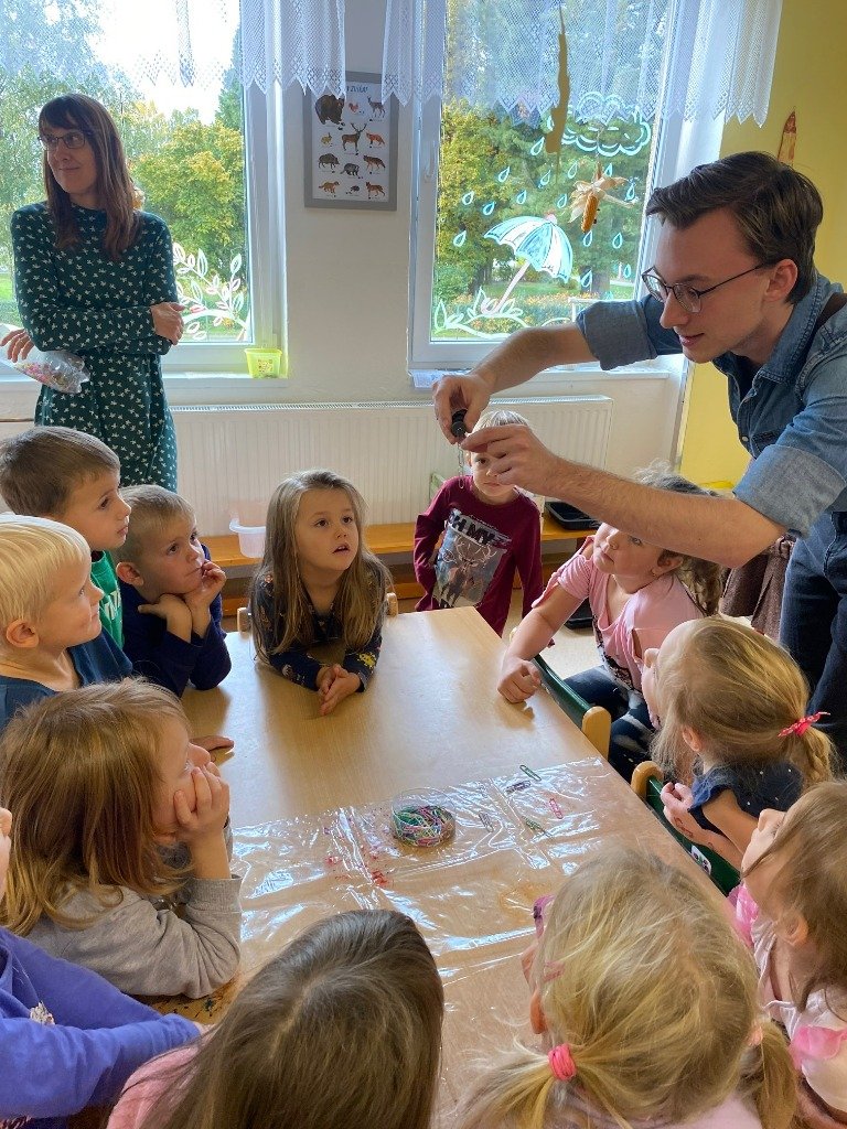 V naší školce Hlavatce jsme minulý pátek měli netradiční dopoledne. Navštívil nás pan Šimon Staněk, student vysoké školy, který dětem přiblížl hravou formou fyzikální zákony. Děti mohly vidět na vlastní oči jak z popela vyrostou Faraonovi hadi, povrchové napětí - kdy silný roztok udrží na bublině obrázek nebo vystřelení papíru z kanónu na vodě. Velmi je zaujala i magnetická síla, kdy si zkoušeli co všechno s obyčejným magnetem dokážeme. Na závěr celého programu jsme si společně zazpívali za doprovodu kytary a klavíru.