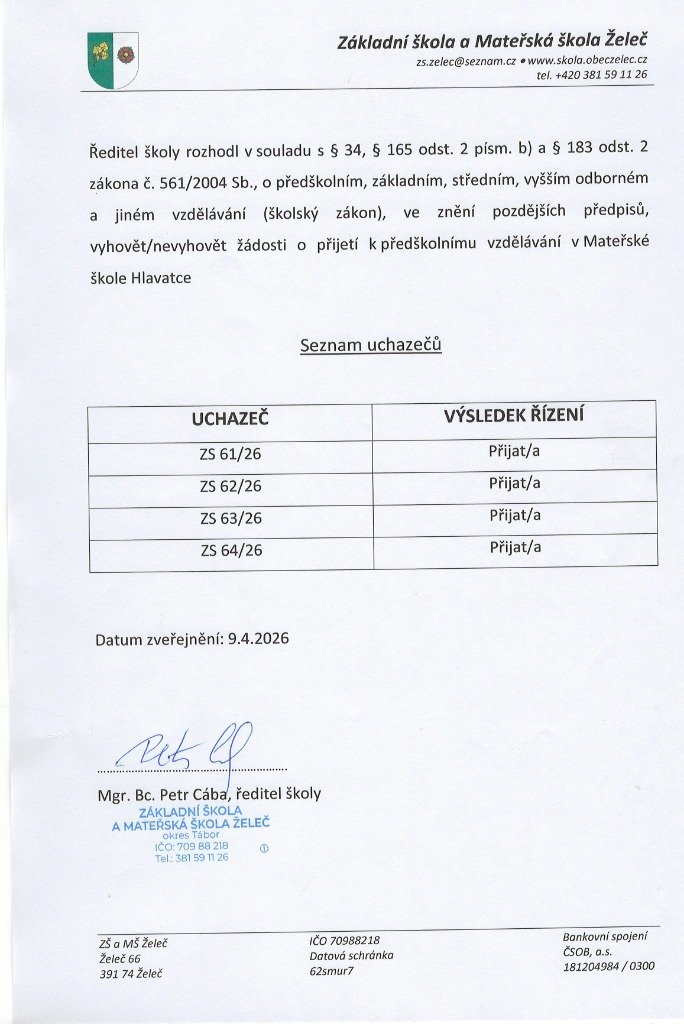 Rozhodntí o příjetí MŠ Hlavatce