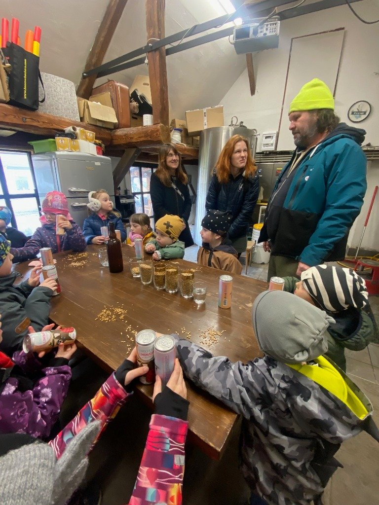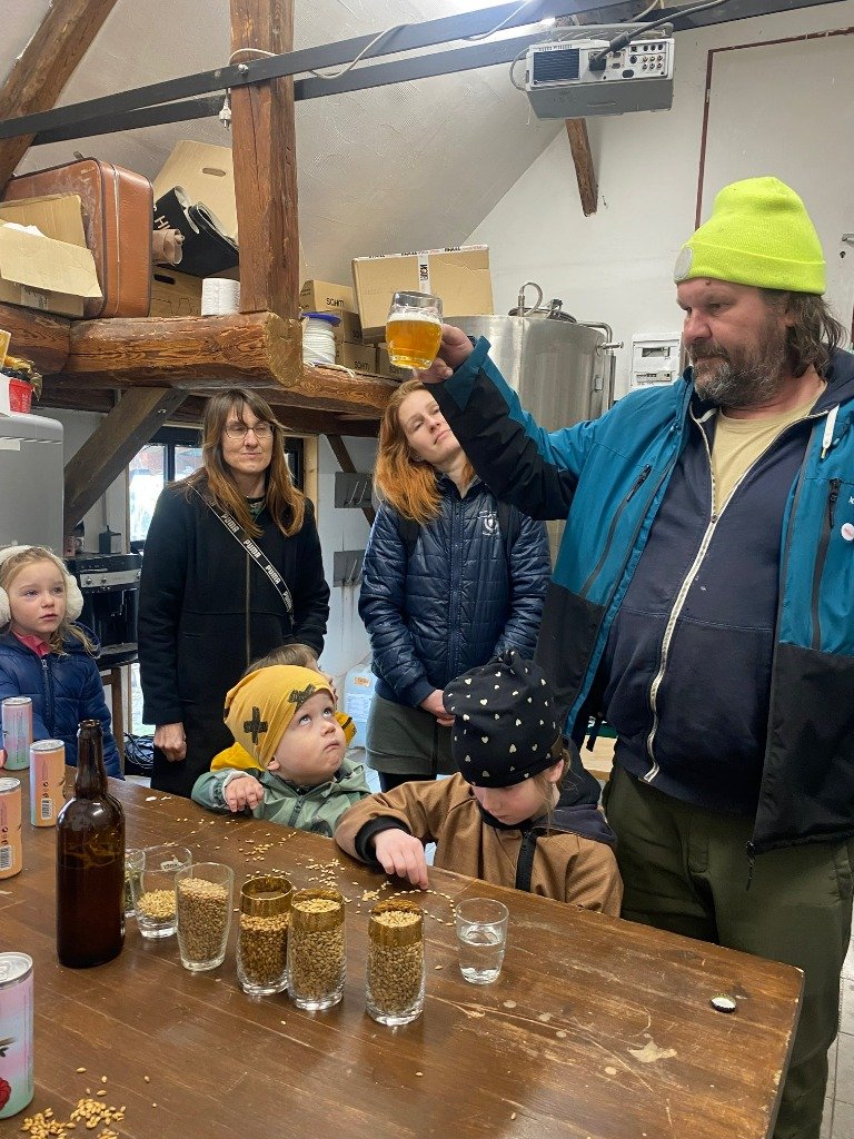 Následovala návštěva rodinného pivovaru Transformátor, kde nám pan Pepa Boháč ukázal kompletně celý pivovar. Dal ochutnat zrníčka ječmene, přičichnout chmele a zodpověděl všetečné otázky všech dětí. Jako takový bonus nám i zahrál na kytaru a baskytaru. Pro každé dítko byla připravena i speciální Lenochodí limonáda pro Bertičku (koupí limonády přispějete na dobrou věc). Návštěva pivovaru nadchla opravdu všechny.