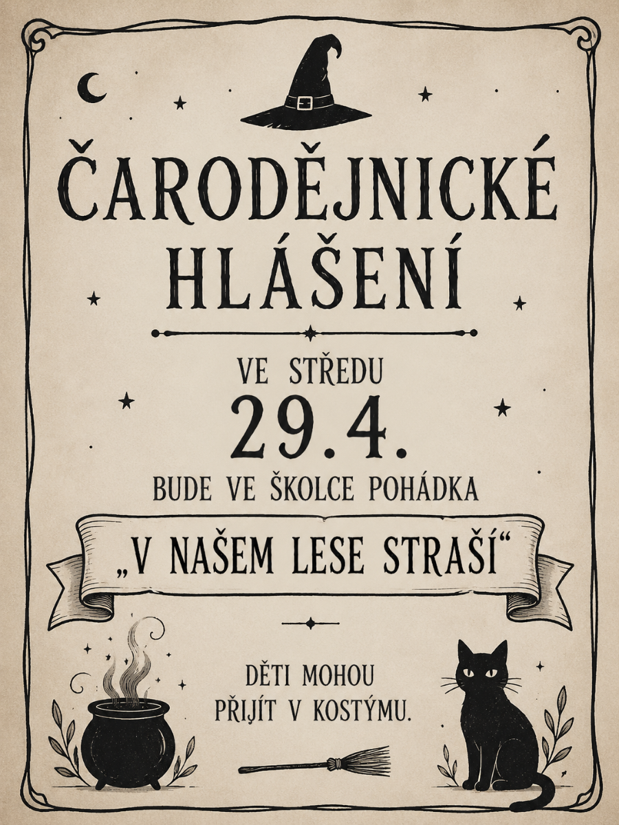 Upozorňujeme, že 2.4.2026 bude provoz MŠ Želeč OMEZEN pouze na dopoledne do 12.30h. Důvodem je školení pedagogického personálu.
