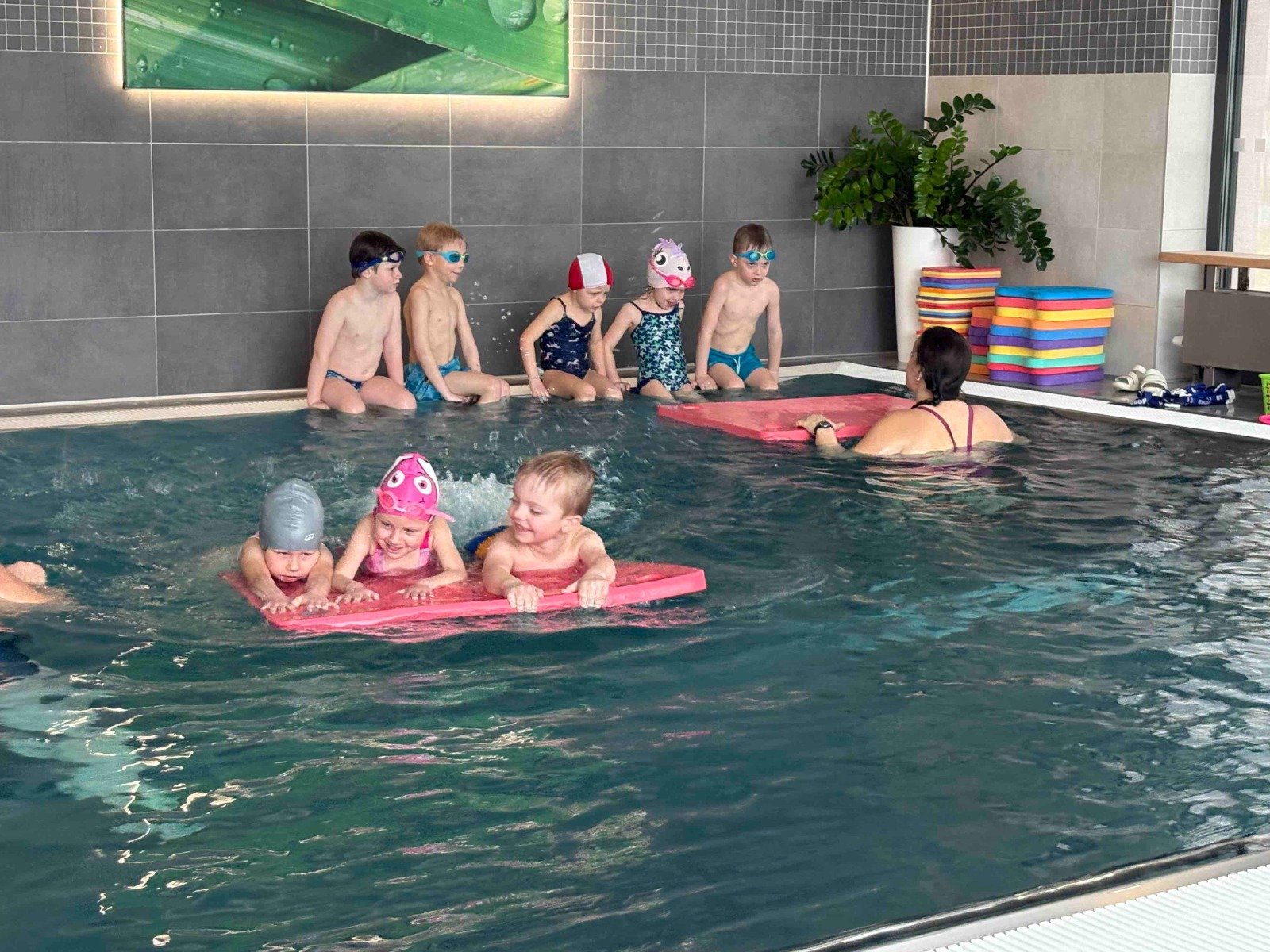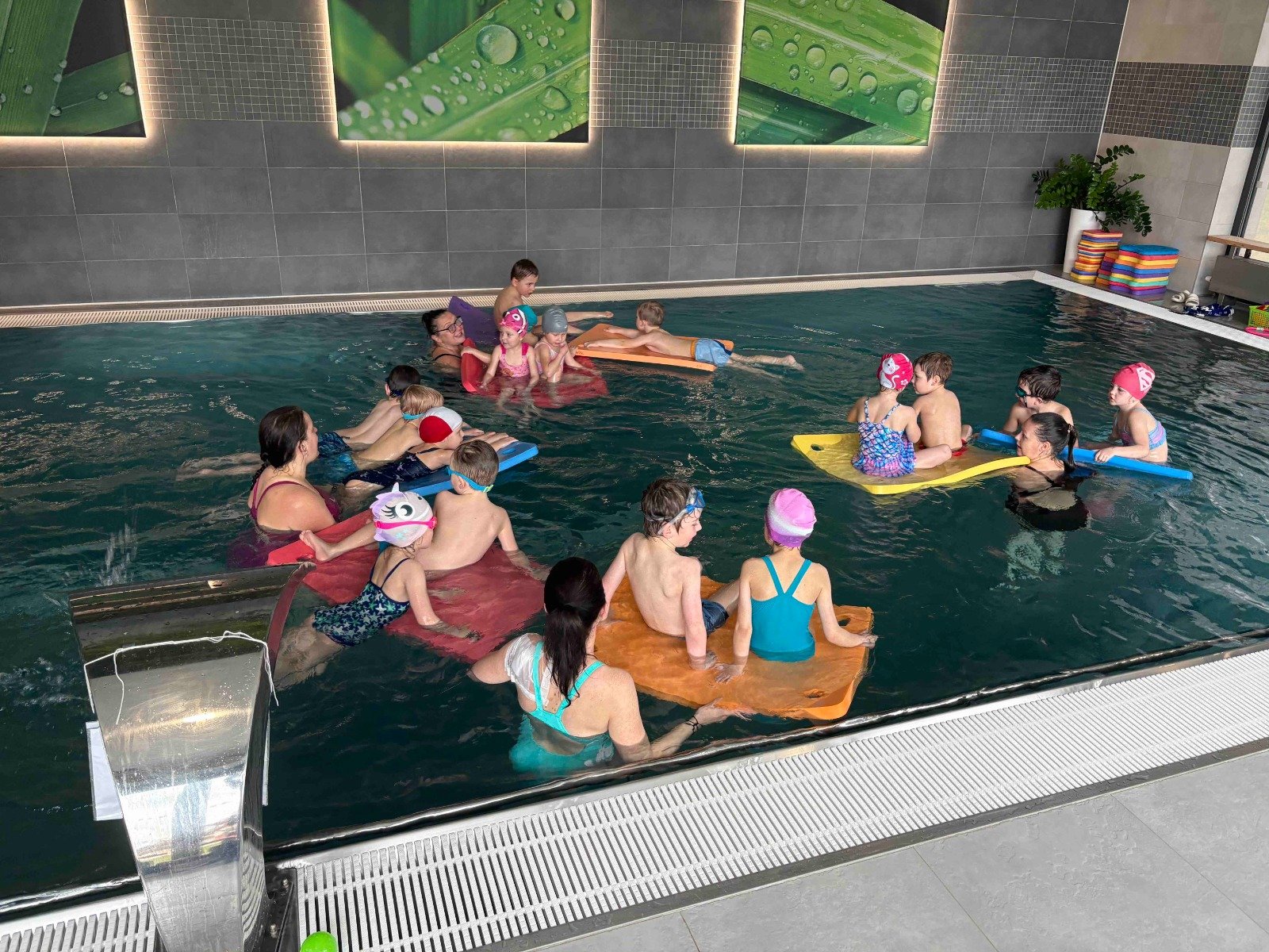 Děti započaly 26.3.2025 kurz plavání v místí wellness zóně. Společně s námi chodí i děti z Hlavatecké školky a jsme rozdelěni na 2 skupiny. Děti jsou šikovné, paní instruktorky z plavecké školy Plaváček je moc chválí. Učí se splívat, cvičí potápění, loví předměty a plavou s destičkami. Děti mají za sebou 2 lekce a jsou z plavání nadšené. Těšíme se, jak se budou postupně v plavání zlepšovat.