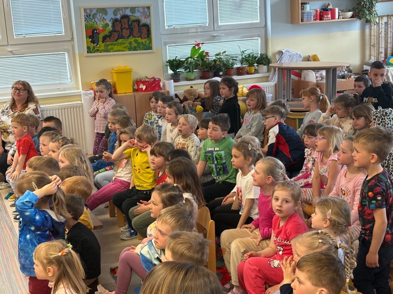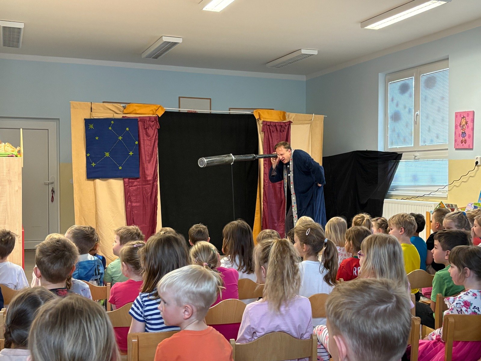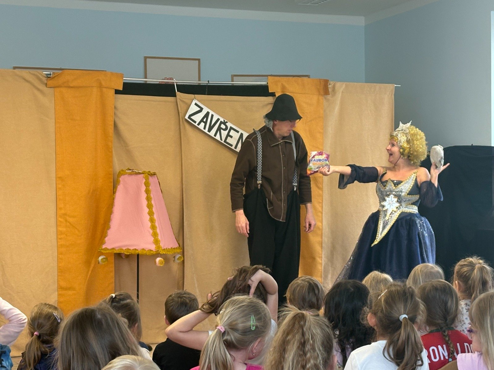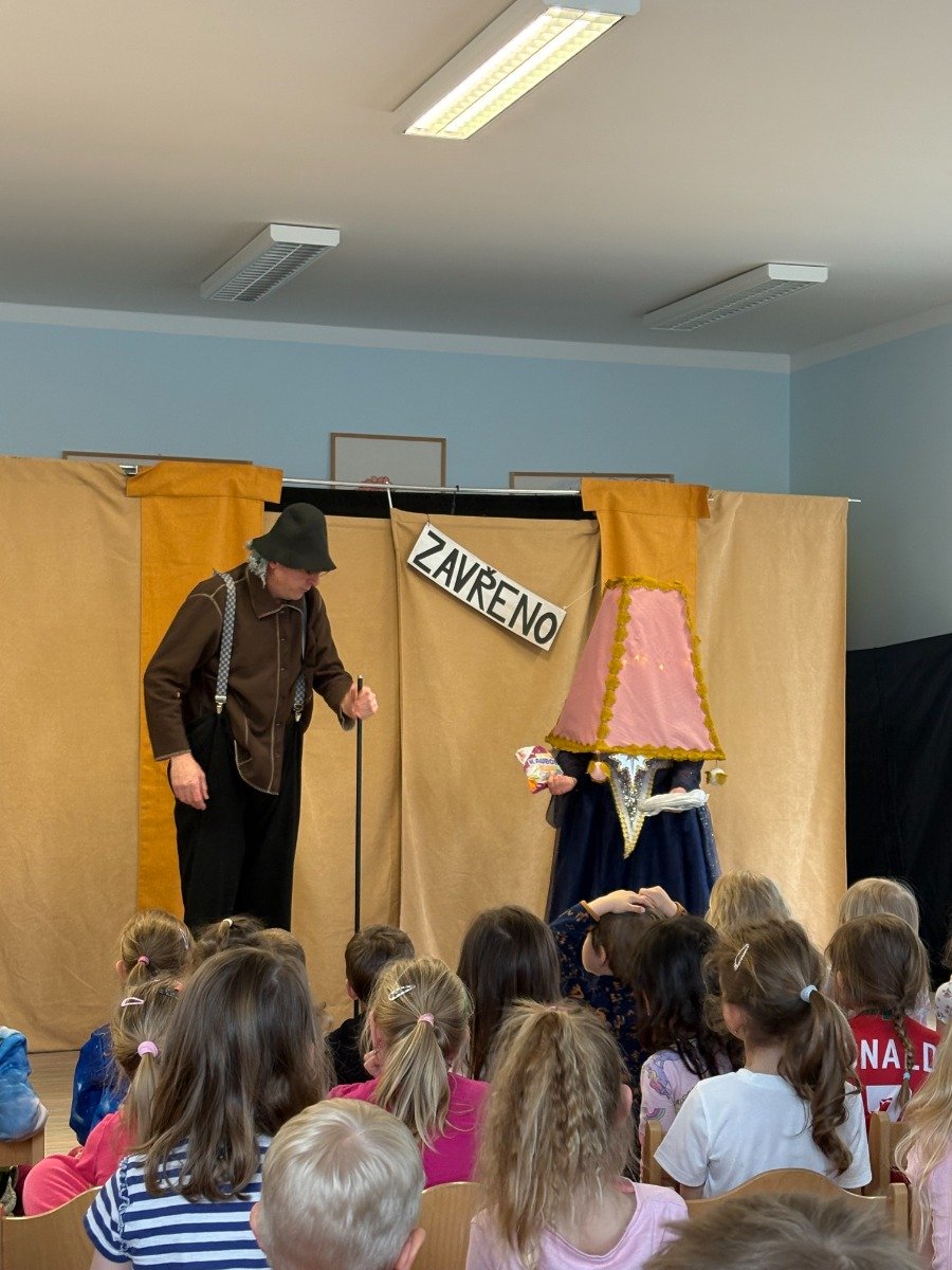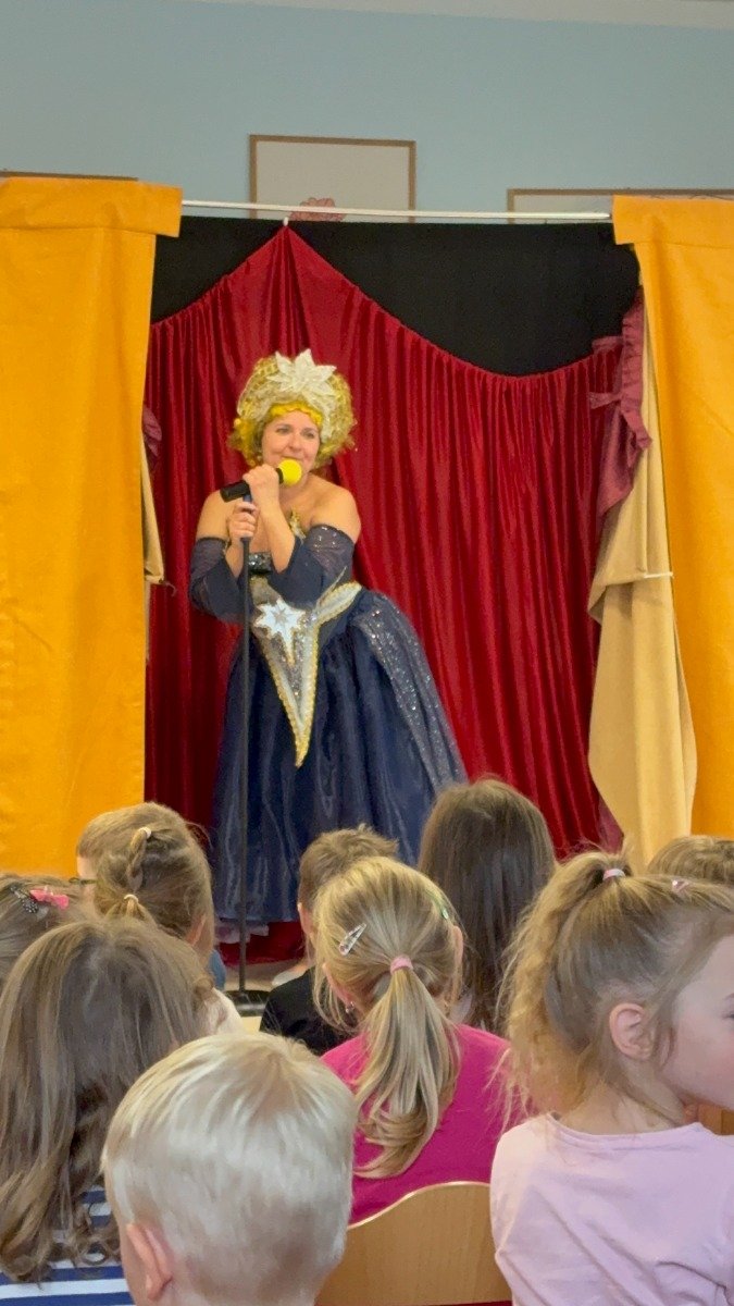 Dne 15.4. jsme shlédli divadelní pohádku o Hvězdičce Lucince, která se chtěla podívat na Zemi mezi nás lidi, a tak spadla na jeden den z oblohy k nám dolu. Součástí představení byl také chytlavý zpěv a nasazení herců bylo úctyhodné. Hvězdička Lucinka prožívá na Zemi zářivá dobrodružství, avšak do setmění se musí vrátit na své místo na obloze, aby nevyhasla a nestal se z ní meteorit. Během dne pomohla nejednomu človíčkovi. Nejprve zaskakovala za slavnou zpěvačku Kometu jako hvězda večera, poté přinášela štěstí fotbalistovi na jeho dresu, dále malému školákovi pomohla k jeho vysněné jedničce s hvězdičkou z diktátu a v neposlední řadě pomohla rozsvítit na cestu starému dědečkovi. Díky dětem a panu hvězdáři, kteří ji pomohli, se Lucinka po všech pozemských dobrodružstvích dostala včas na své místo na obloze, kde dodnes září na cestu nám všem, kteří si na ni vzpomenou. Děti byly vtaženy do děje po celou dobu představení, ochotně spolupracovali s herci a moc si pohádku užívaly. Představení bylo velice vydařené, těšíme se na příště.