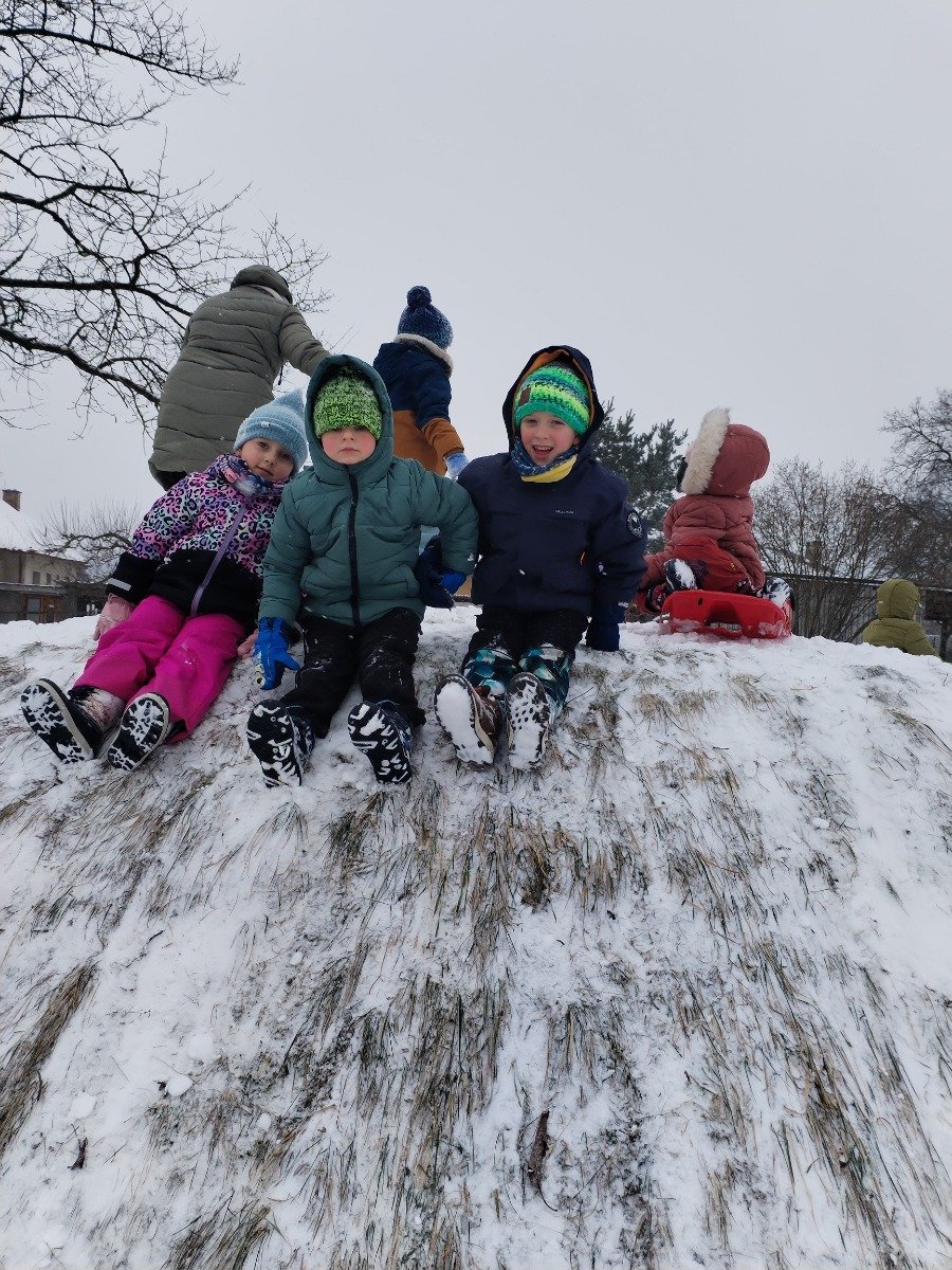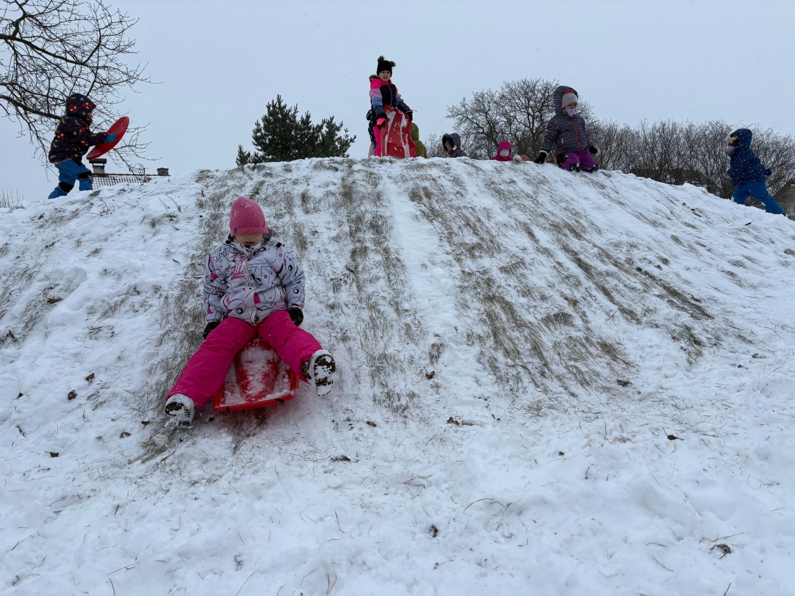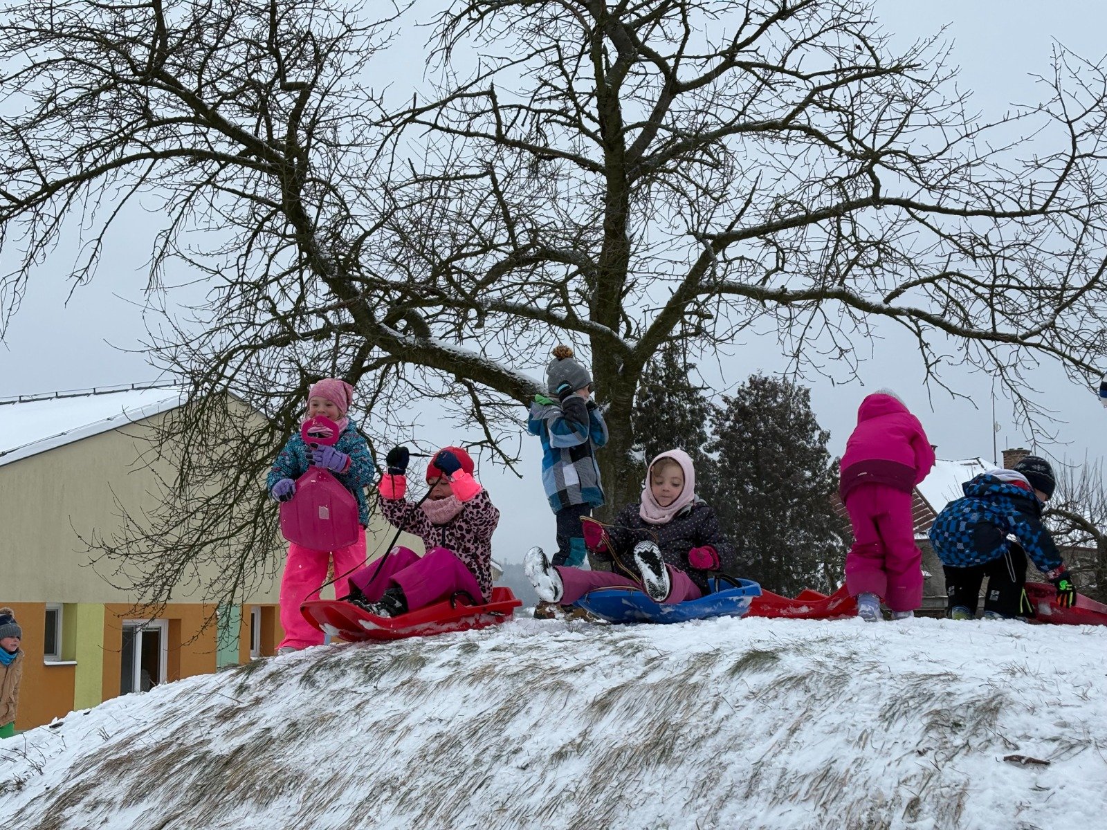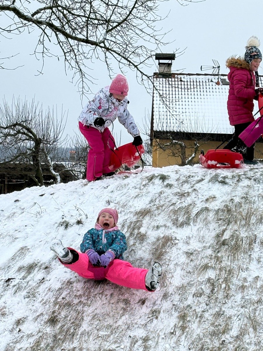 Ze čtvrtka na pátek 9.1.2026 k nám přišla velká sněhová nadílka. Pro někoho mrazivá kalamita, pro nás zimní radovánky v plném proudu. Sníh padal celé dopoledne a tak to některé z nás vytáhlo ven už po svačince. Děti ometly boby a lopaty od pavučin ze sklepa a hurá na kopec. Sranda byla veliká, sníh poletoval všude kolem nás, děti si užívaly sníh plnými doušky a ani paní učitelky nezůstaly pozadu. Jezdilo se na bobech, lopatách, talířích, válely se sudy a celou zahradu nám zdobily andělé. Doufáme, že tohle počasí bez větších mrazů nám vydrží co nejdéle. A už zase sněží, tak naviděnou na kopci :-)