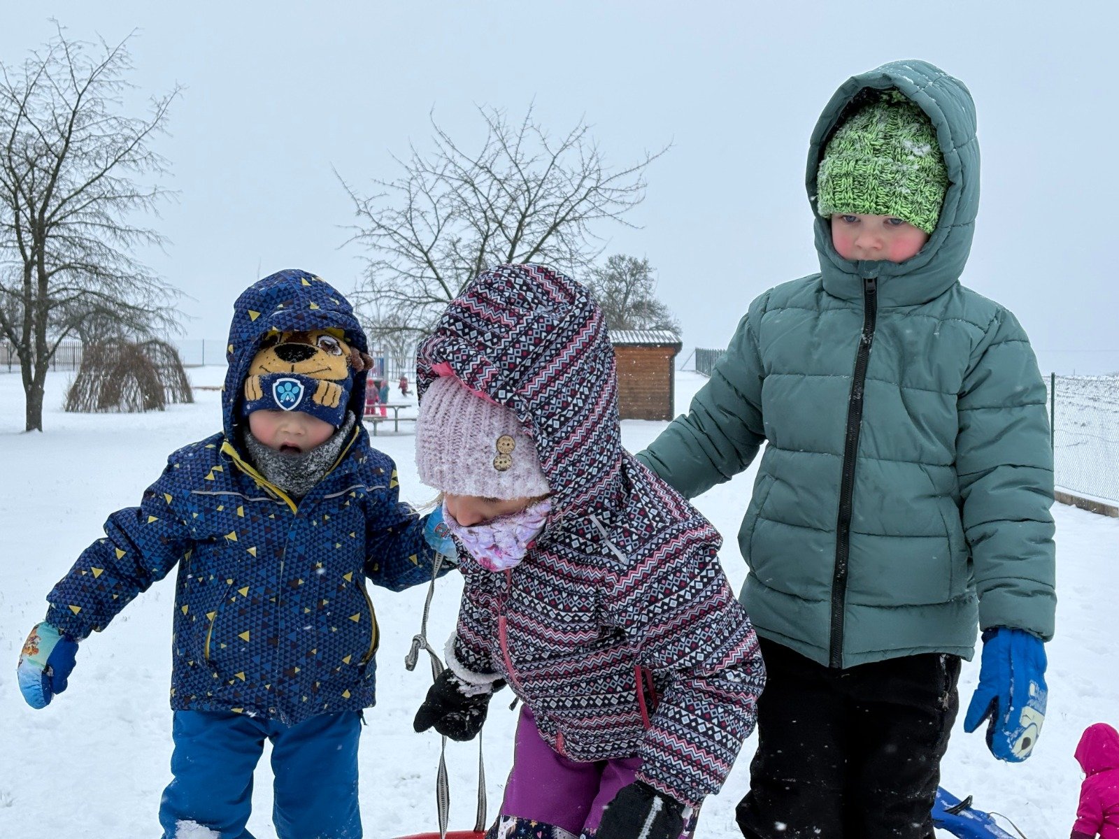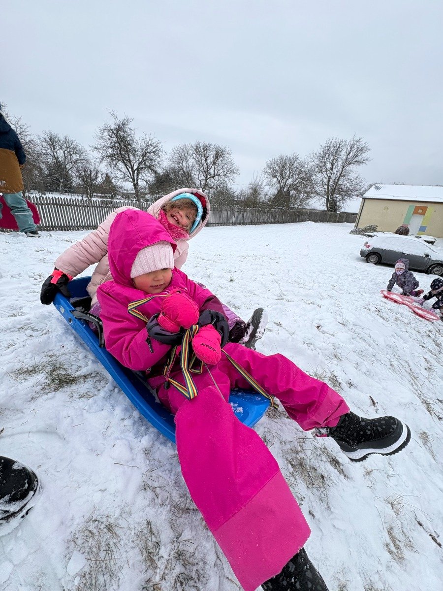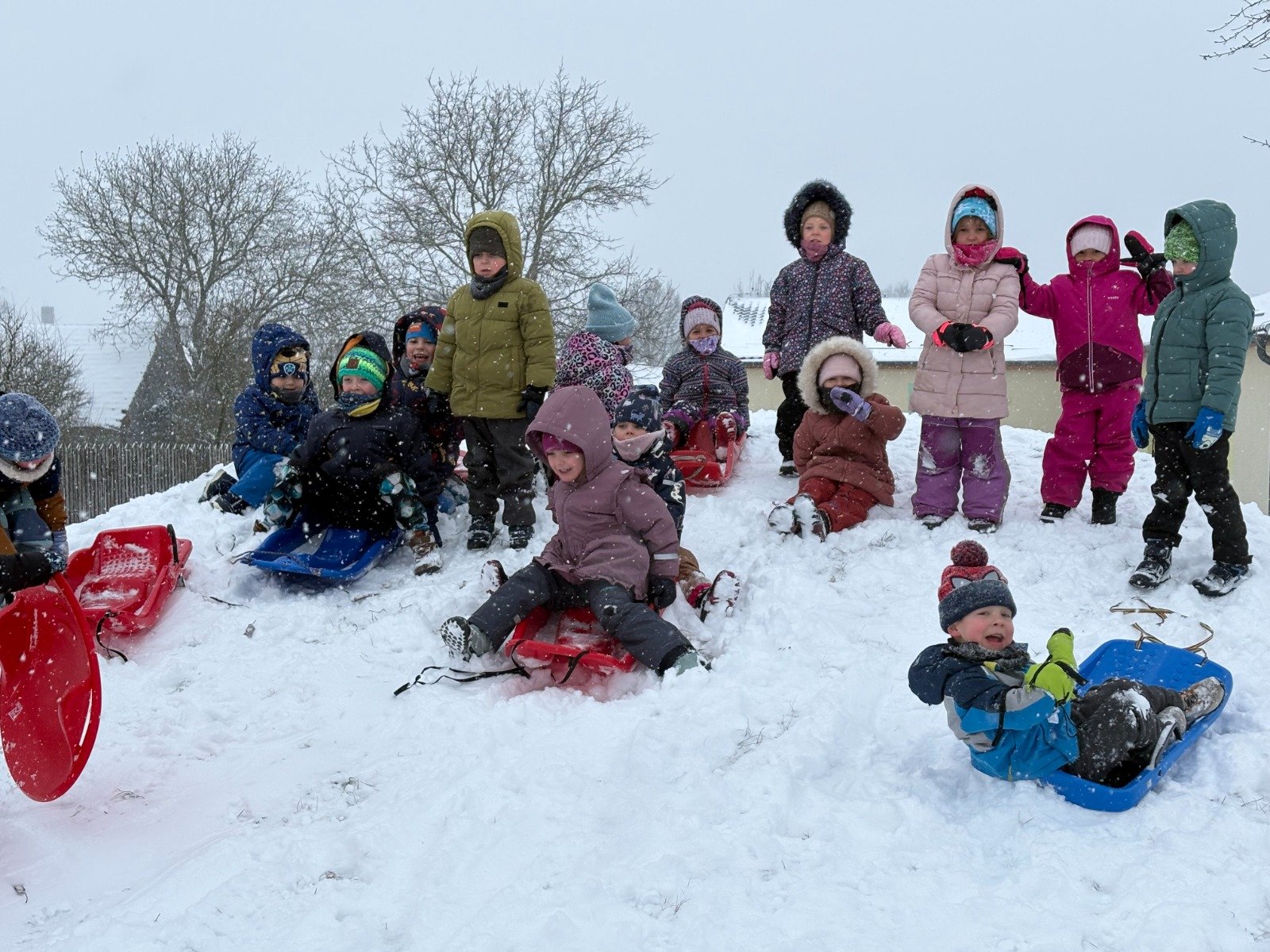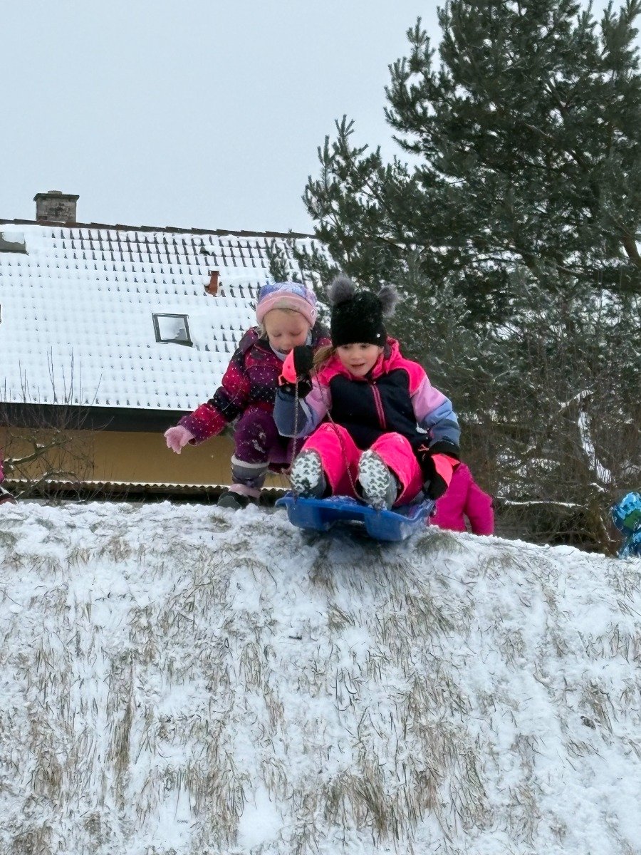 Ze čtvrtka na pátek 9.1.2026 k nám přišla velká sněhová nadílka. Pro někoho mrazivá kalamita, pro nás zimní radovánky v plném proudu. Sníh padal celé dopoledne a tak to některé z nás vytáhlo ven už po svačince. Děti ometly boby a lopaty od pavučin ze sklepa a hurá na kopec. Sranda byla veliká, sníh poletoval všude kolem nás, děti si užívaly sníh plnými doušky a ani paní učitelky nezůstaly pozadu. Jezdilo se na bobech, lopatách, talířích, válely se sudy a celou zahradu nám zdobily andělé. Doufáme, že tohle počasí bez větších mrazů nám vydrží co nejdéle. A už zase sněží, tak naviděnou na kopci :-)
