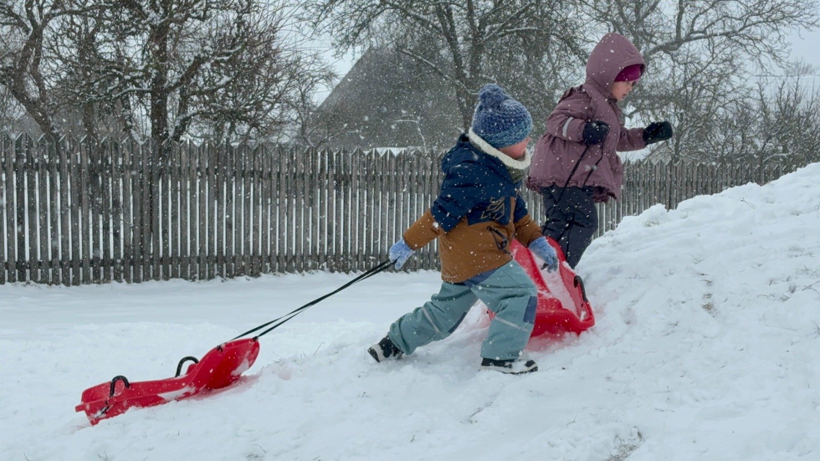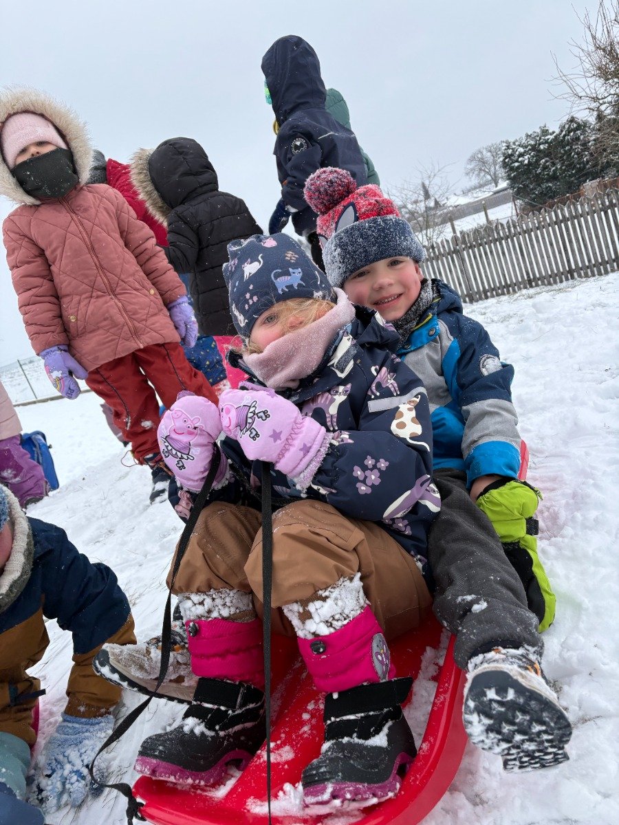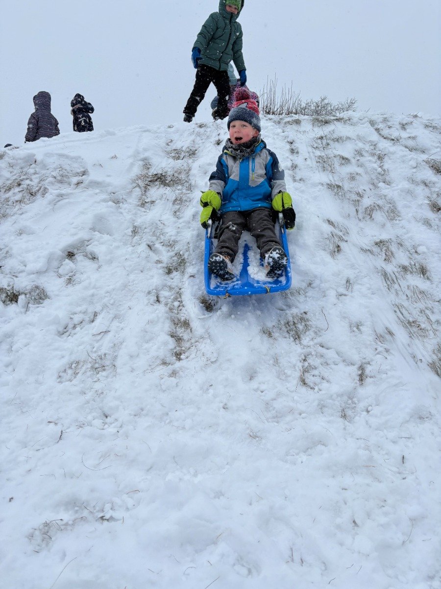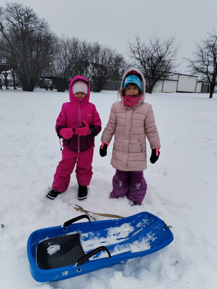Ze čtvrtka na pátek 9.1.2026 k nám přišla velká sněhová nadílka. Pro někoho mrazivá kalamita, pro nás zimní radovánky v plném proudu. Sníh padal celé dopoledne a tak to některé z nás vytáhlo ven už po svačince. Děti ometly boby a lopaty od pavučin ze sklepa a hurá na kopec. Sranda byla veliká, sníh poletoval všude kolem nás, děti si užívaly sníh plnými doušky a ani paní učitelky nezůstaly pozadu. Jezdilo se na bobech, lopatách, talířích, válely se sudy a celou zahradu nám zdobily andělé. Doufáme, že tohle počasí bez větších mrazů nám vydrží co nejdéle. A už zase sněží, tak naviděnou na kopci :-)