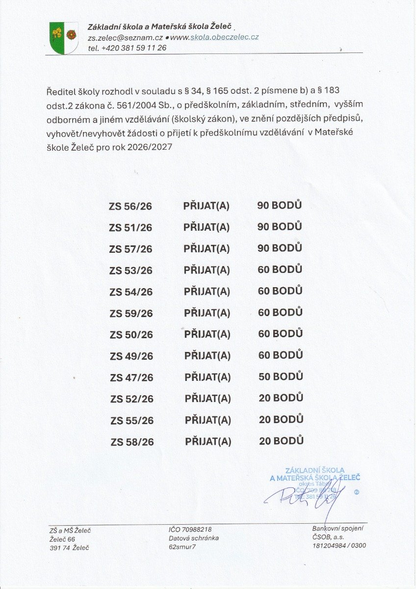 Rozhodnutí o přijetí do MŠ ŽELEČ