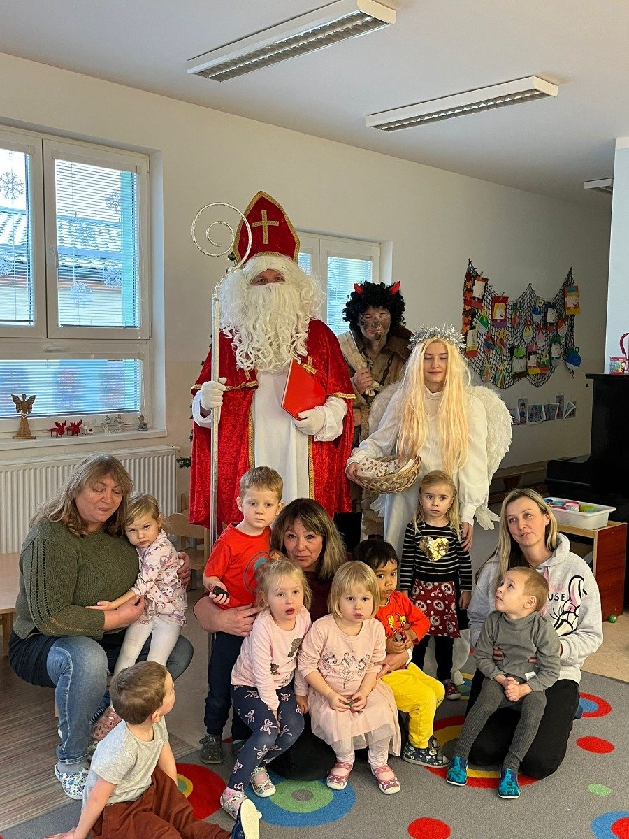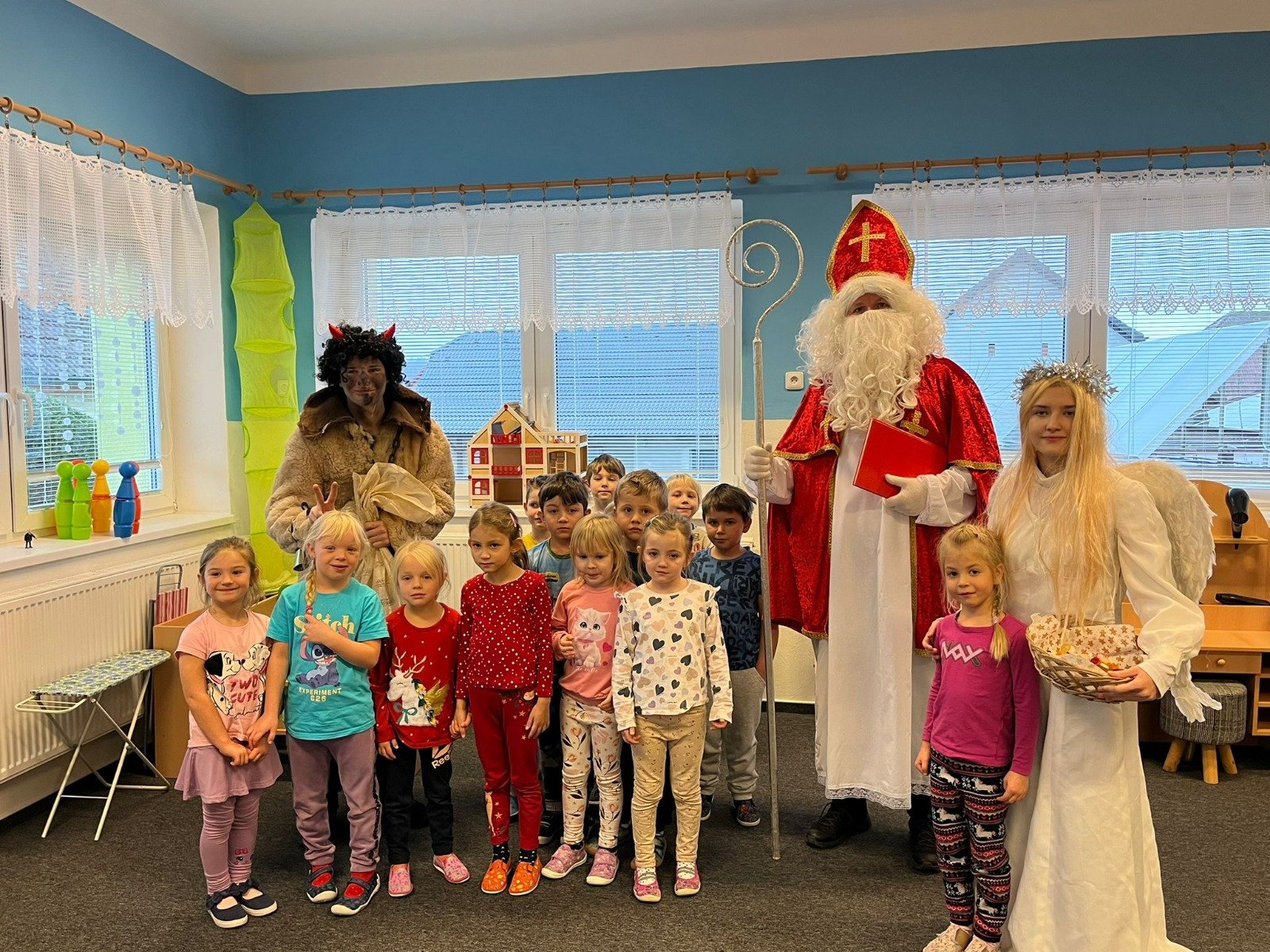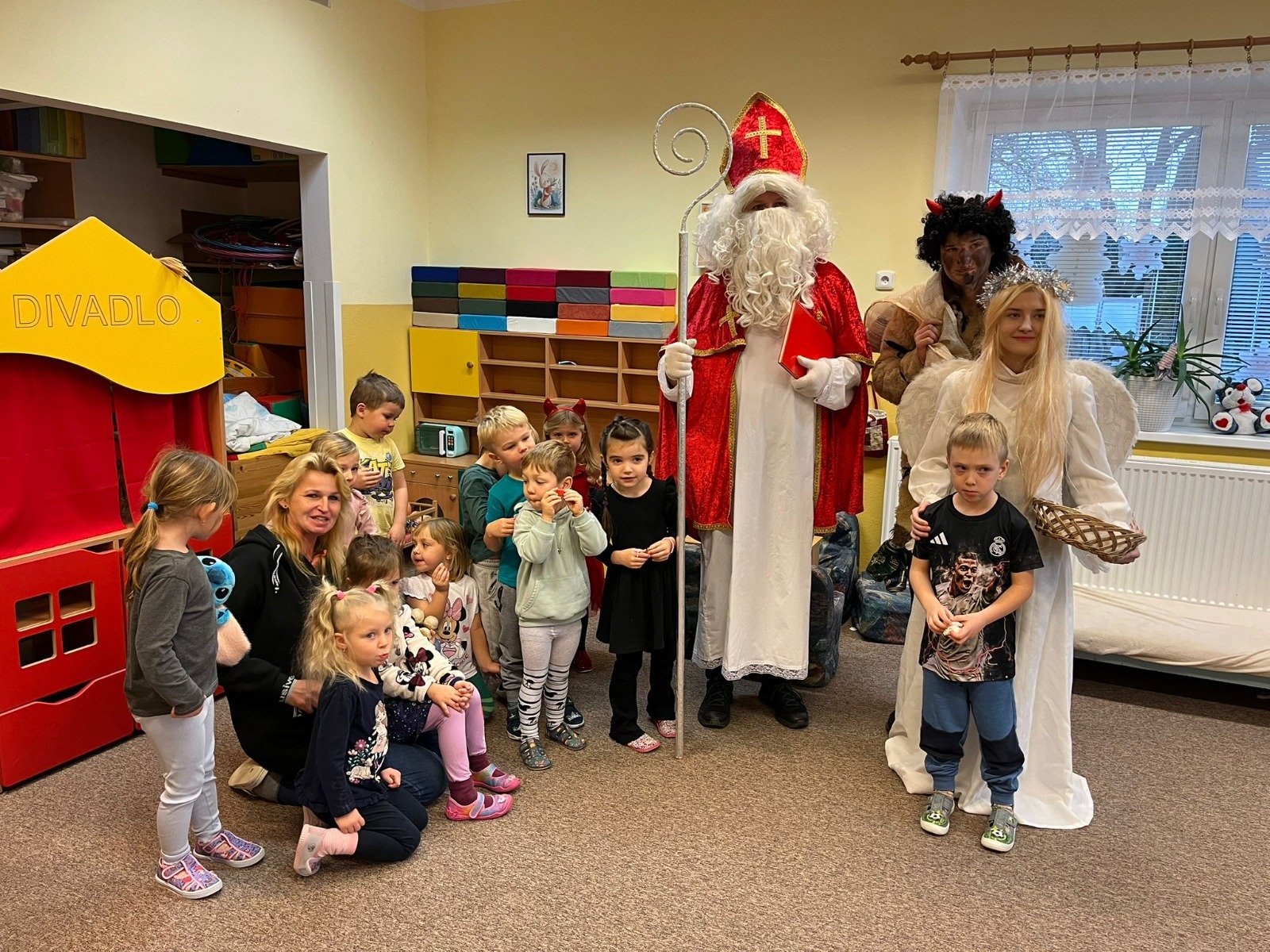 Rok uběhl jako voda a je to tady..... školkou chodí Mikuláš! A není sám! Vjeho družině nechybí anděl a čert. V očích dětí je vidět strach, ale i očekávání. Bude čert hodný? Neodnese někoho v pytli? A dostaneme nějakou nadílku? Nebo jen uhlí? Jako každý rok, tak i letos, čert nikoho neodnesl. I když to paní kuchařka měla s chlupem :) Andílek všem nadělil balíček, ale nic není zadarmo......každá třída přednesla krásnou básničku, paní učitelka si zatancovala s čertem dupáka, potom ještě společné focení a naviděnou zase příští rok !