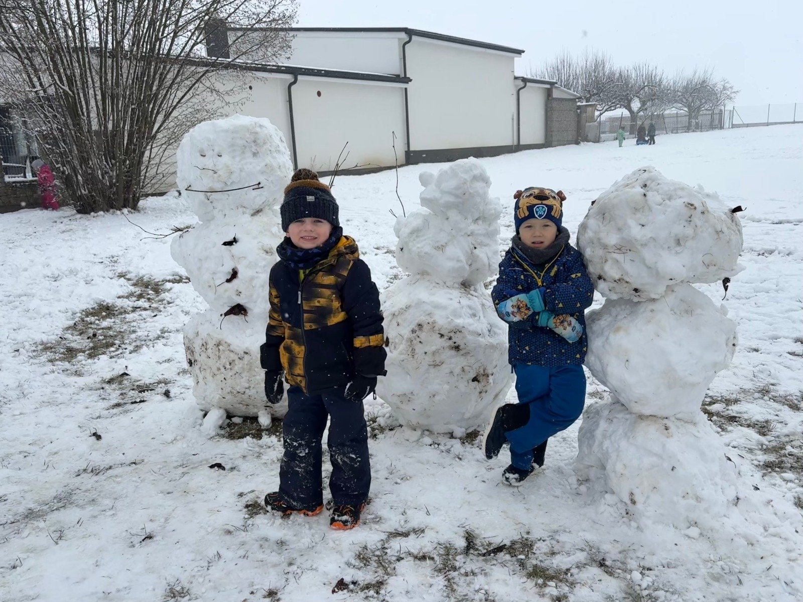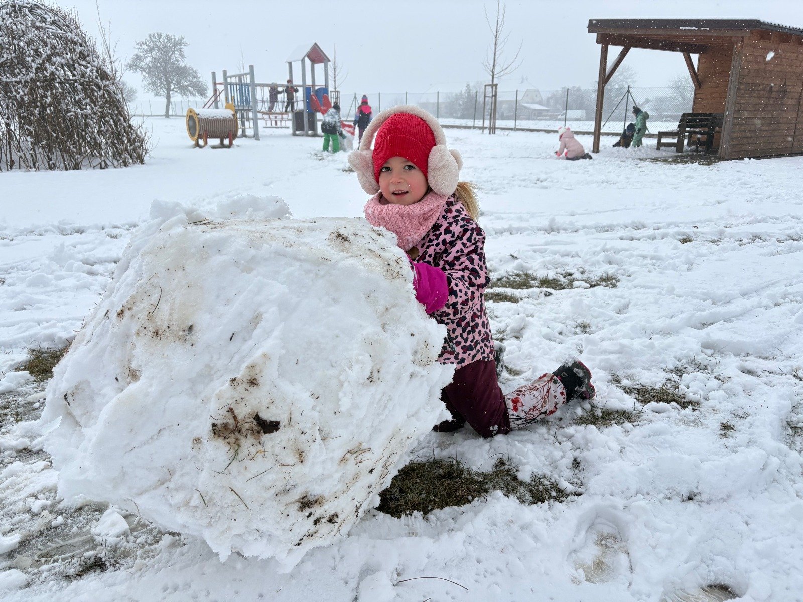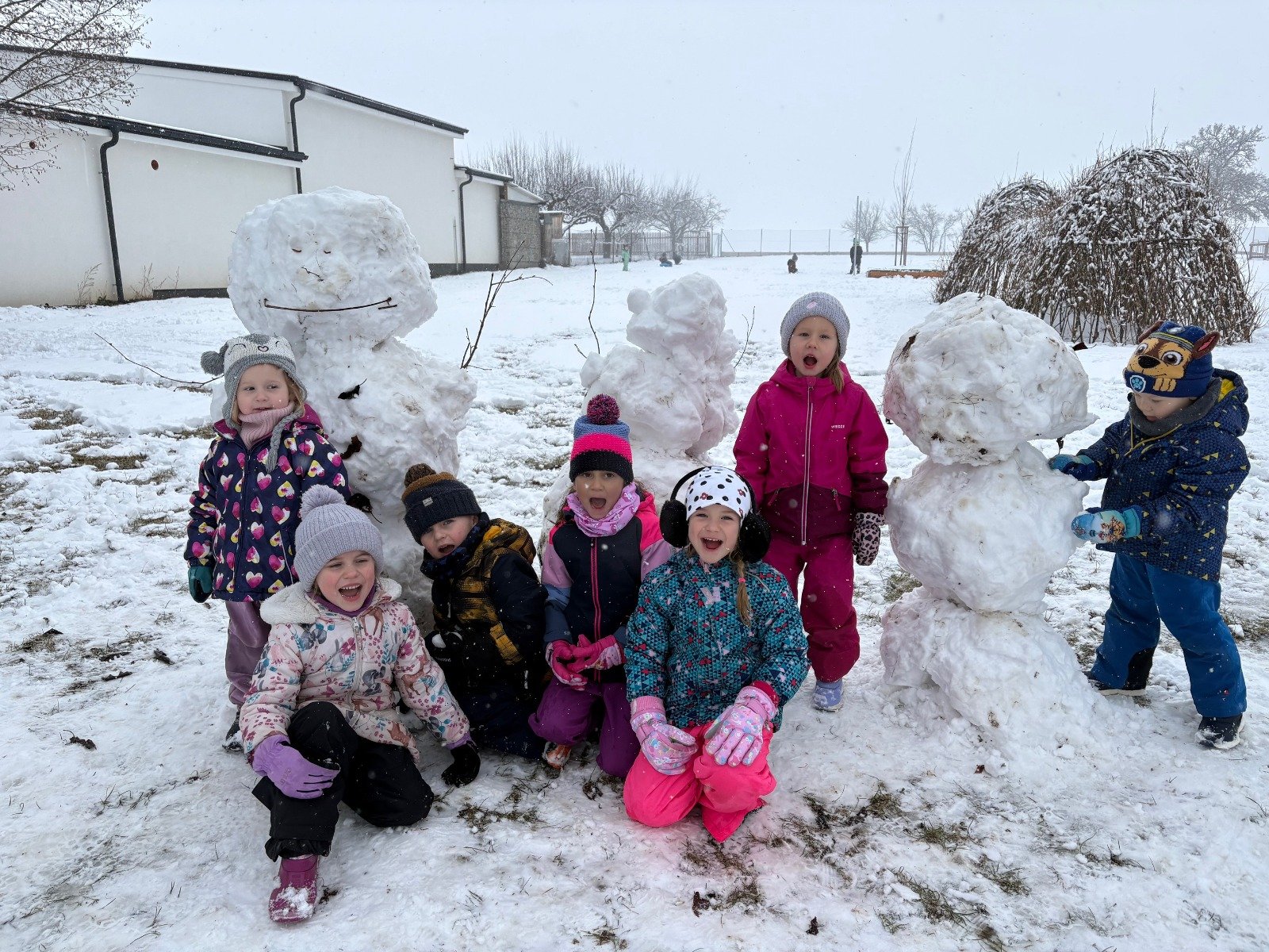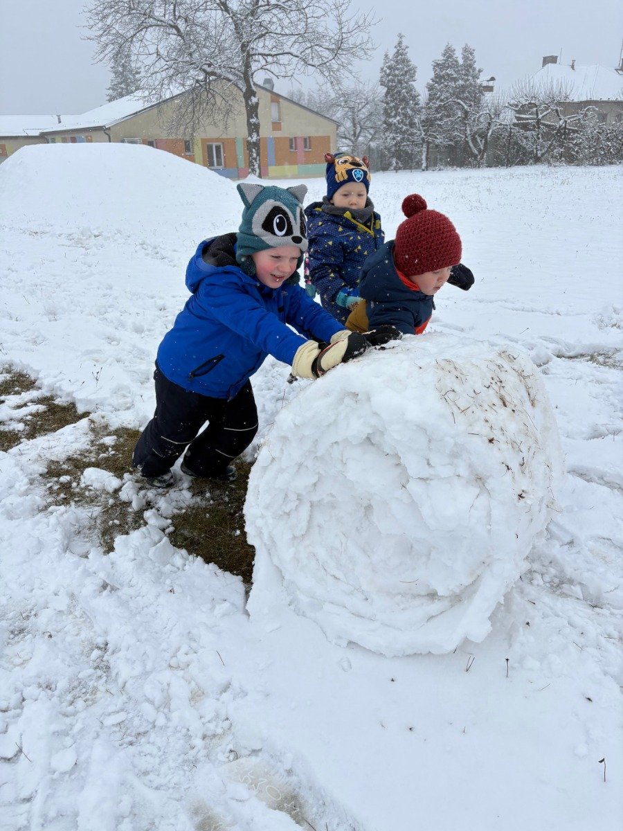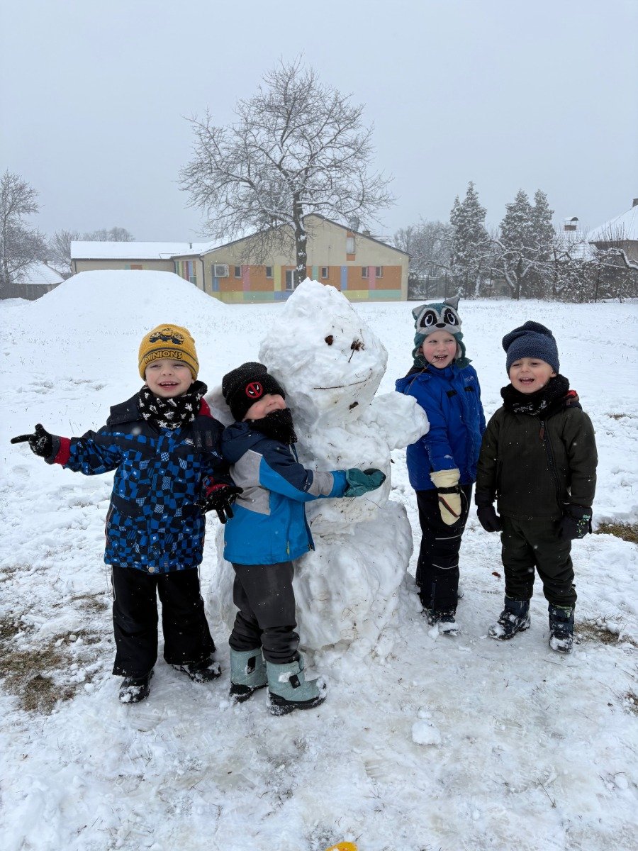 Děti si letošní zimu užívají plnými doušky, ve skupinách napříč třídami se domluvily, kdo s kým postaví sněhuláka, či paní sněhulákovou a nakonec jsme na zahradě MŠ měli celou rodinu včetně známého pohádkového Olafa.